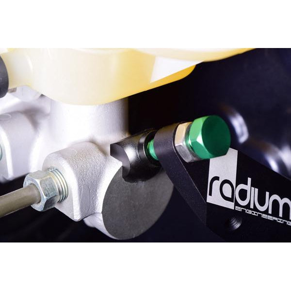 Because the master cylinder flexes in an arcuate path, a specially designed CNC machined foot contacts the master cylinder to counteract the arc movement. Preload is adjusted with the anodized aluminum green bolt then locked in place with the stainless steel jam nut. Installation is simple and takes less than 30 minutes.